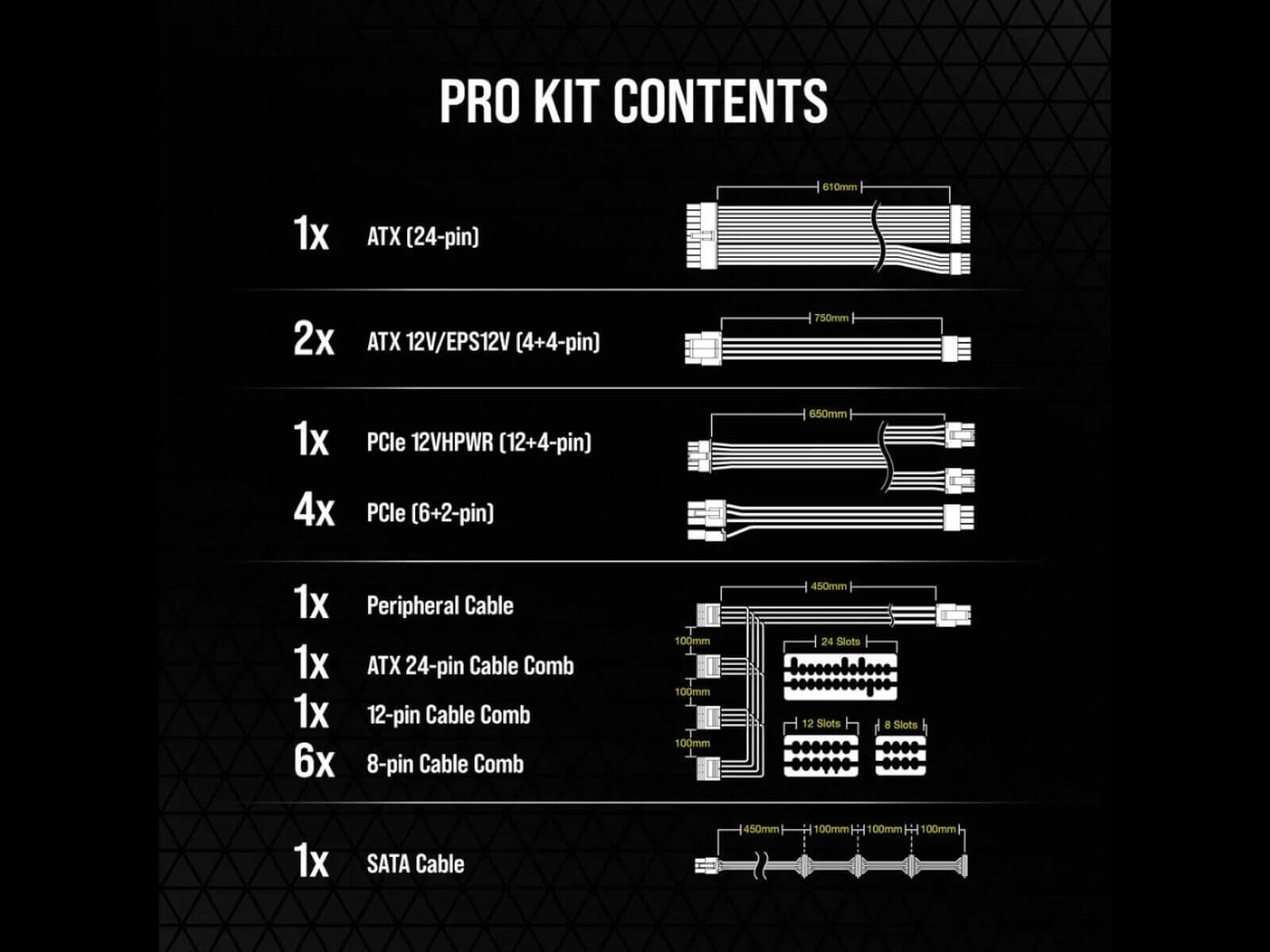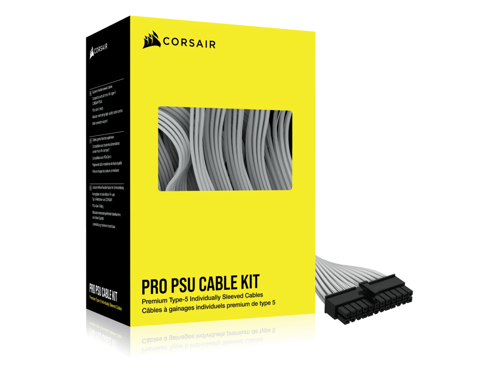 Upgrade your CORSAIR Type-5 power supply’s cables with the CORSAIR Premium Individually Sleeved Type-5 PSU Cables Pro Kit, containing a full range of cables in flexible triple-layer mesh paracord sleeving.