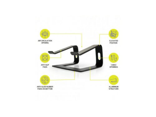 This product is an ergonomic notebook stand, compatible with 10 “to 15.6” notebooks. Its ergonomic design allows the passage of cables optimizing the workspace. Safety hooks and non-slip pads prevent the device from falling off the stand.